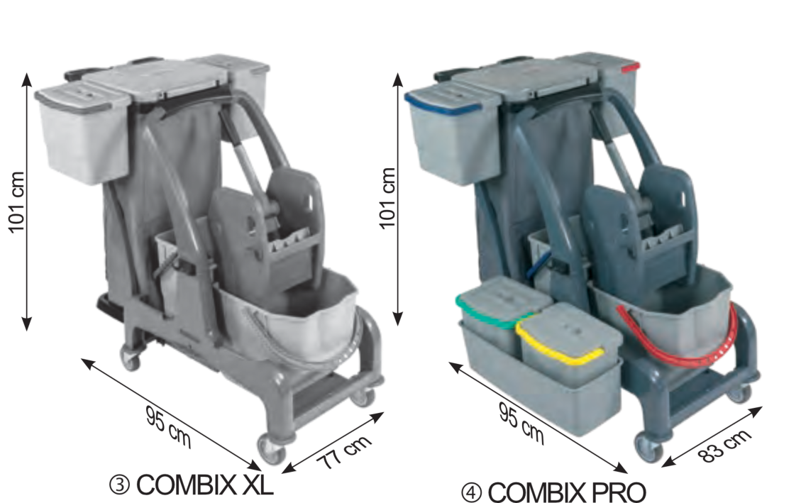 Für die Flur-, Zimmer- und Badreinigung in öffentlichen Einrichtungen, Büros, Hotels, Pensionen. Farblich getrennte Wischeimer und Halterung für Wäsche-/ Müllsack.Der Reinigungswagen in Profiqualität besteht aus zwei robusten Kunststoff Bodenplatten, wobei die hintere Ablage je nach Bedarf abgenommen werden kann. Die stabilen Metall-Lenkrollen und die großen, gummierten Hinterräder erfüllen die Anforderungen für den täglichen, Einsatz. Der Deckel über dem Wäsche-/ Müllsack kann bequem vom ergonomisch geformten Schubbügel aus bedient werden. Ein Mopp oder Besen kann sicher im integrierten Halter fixiert werden. Für das Warnschild ist eine gesonderte Halterung am Rahmen integriert. Serienmäßig wird der PuriX mit vier Eimern, einer seitlichen Moppablage, geräumigem 120 Liter Wäsche-/Müllsack und einer Doppelbacken-Mopp-Presse ausgeliefert. Am Wagen kann eine Medusa Akkukehrmaschine mitgeführt werden.